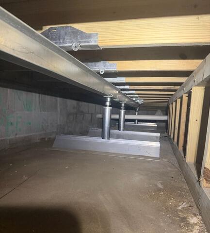 Our team installed heavy-duty crawl space support jacks to reinforce the floor system and restore proper support. These adjustable steel posts are set on stable footings and designed to permanently stabilize sagging floors while withstanding long-term ground movement.